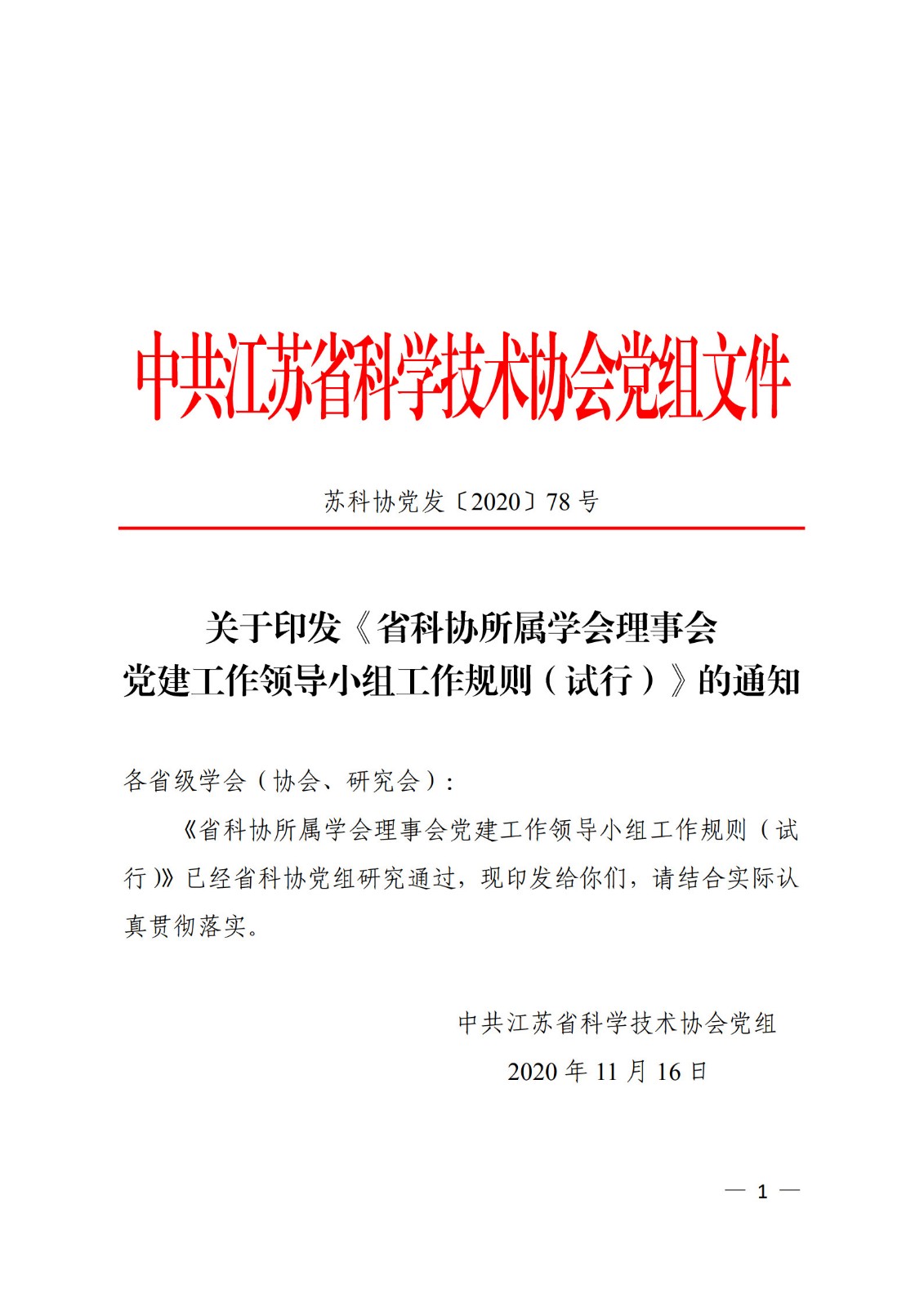 关于印发《省科协所属学会理事会党建工作领导小组工作规则(试行)》的通知